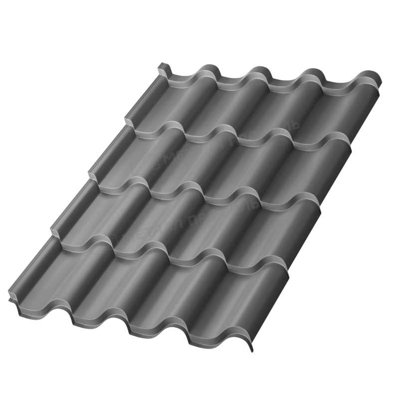Профиль Монтерроса-ML имитирует натуральную черепицу с плавными волнами и симметричным дизайном. Высота волны — 24 мм, шаг — 350 мм, что обеспечивает отличную жесткость и простоту монтажа. Толщина стали 0,5 мм позволяет материалу выдерживать значительные снеговые и ветровые нагрузки. Этот профиль подходит для скатных крыш с углом наклона от 12 градусов, обеспечивая герметичность и эстетичность. Темно-серый оттенок подчеркивает рельеф, создавая эффект объемности.